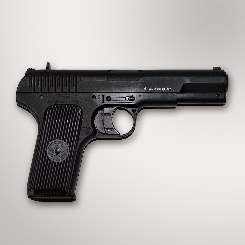 Центр внимания — на оружии, точнее полноценном макете пистолета, который отличается от настоящего только тем, что не стреляет боевыми патронами.