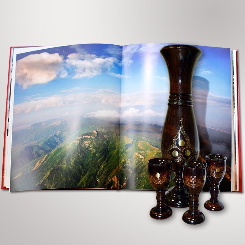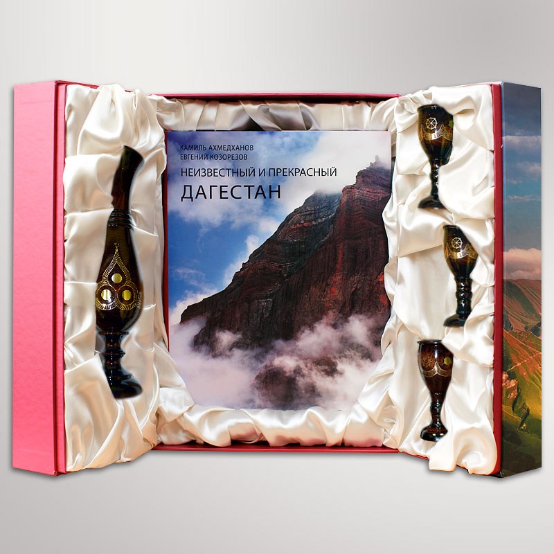 Книга помещена в стильный короб, в котором есть еще и подарочный набор унцукульских мастеров  — изящная ваза и 3 рюмки, изготовленные вручную по старинной технологии. Унцукульские изделия из дерева — шедевры народного творчества, признанные во всем мире. Их изготоваливают из вишнёвого дерева, на поверхность которого наносят орнамент из серебряной проволоки - тысячи маленьких кусочков серебра мастер кропотливо вбивает в дерево, создавая орнаментальные рисунки, ставшие классикой элегантного декора. Унцукульские изделия - это великолепные интерьерные подарки, сделанные мастерами вручную по древней технологии, которой уже много сотен лет.