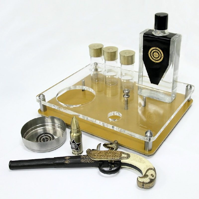 Подарочный комплект помещен в стильный деревянный короб, который исполнен как дуэльный футляр (очень удобно дарить). Возможности для персонализации набора — очень широкие. Надписи, логотипы и шильды могут быть нанесены на прозрачную поверхность столешницы, на штоф, пепельницу или крышку подарочного короба.