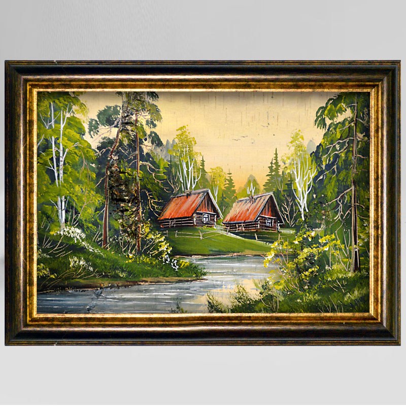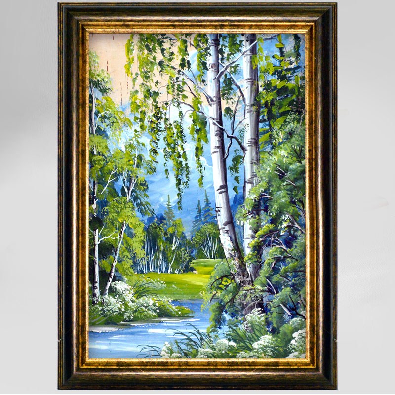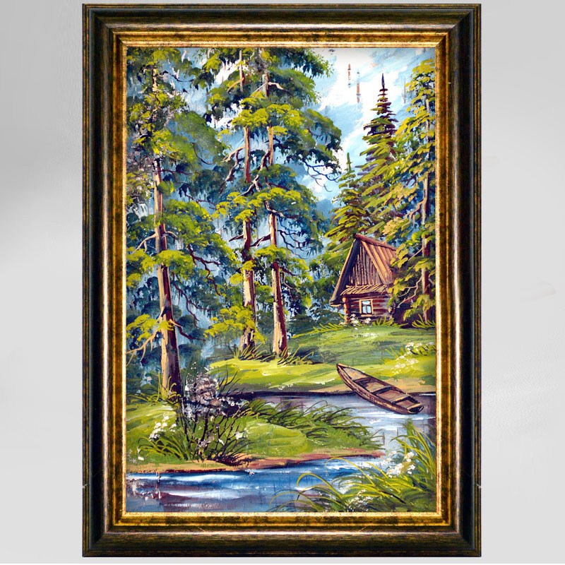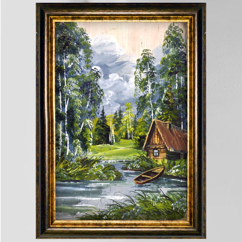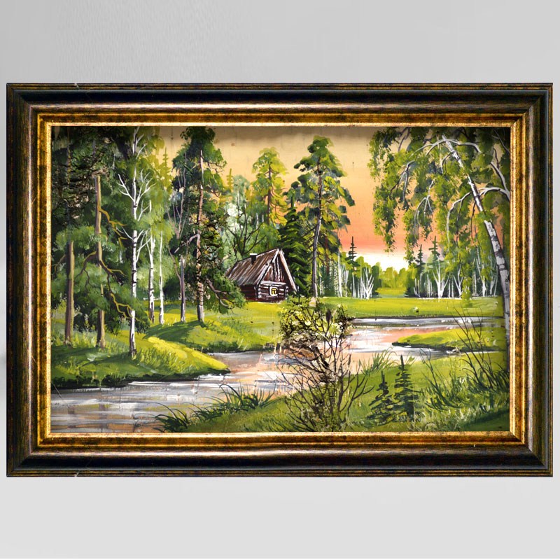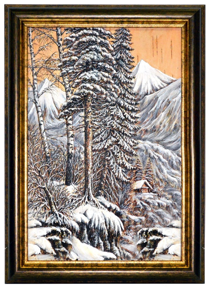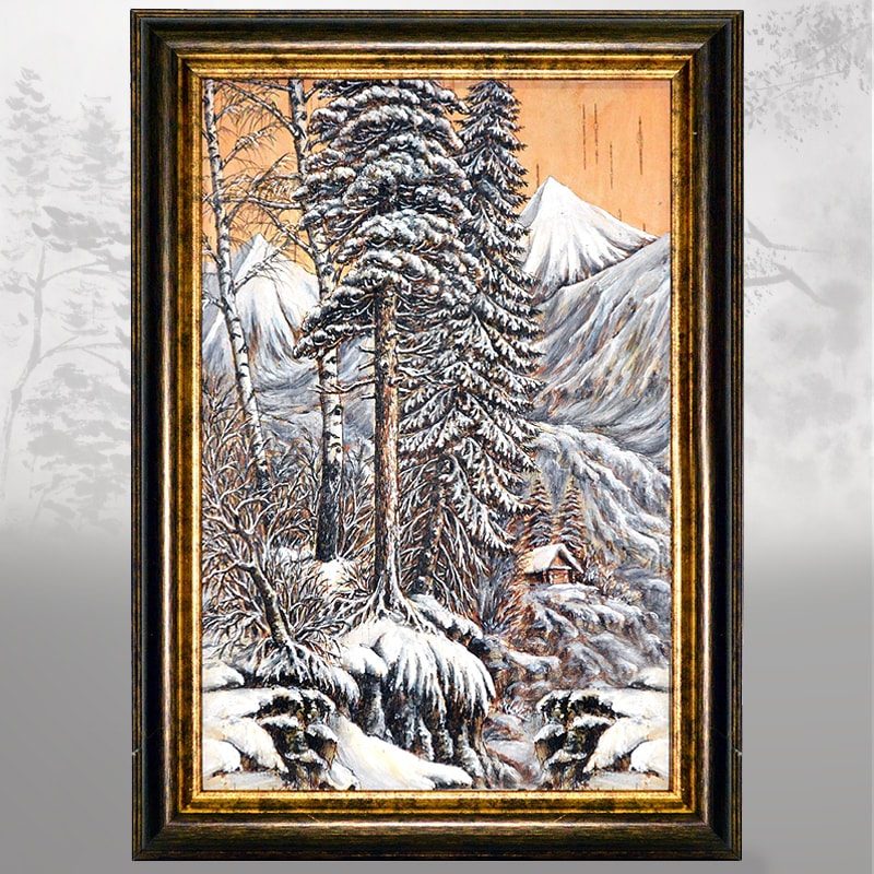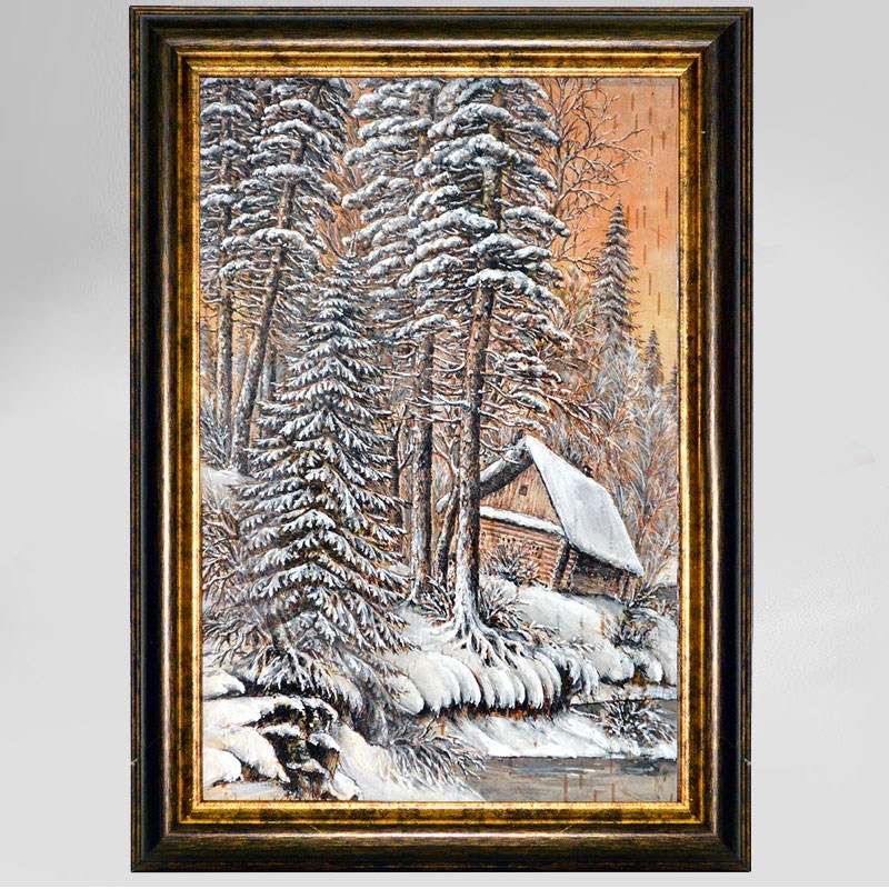 Картина на бересте, изображающая заповедные участки дремучей тайги.