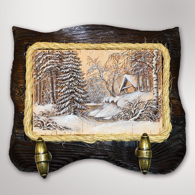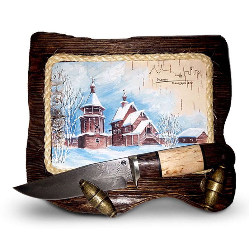 Картина сама по себе уникальна, в её основе – брашированная доска из вяза и таёжный пейзаж на берестяной коре. В нижней части доски есть держатели для ножа, которому не место в столе, ведь он должен висеть в кабинете на самом видном месте, демонстрируя всем, что хозяин - настоящий мужчина. И нож не абы какой - ручная работа, дамасская сталь, карельская береза.