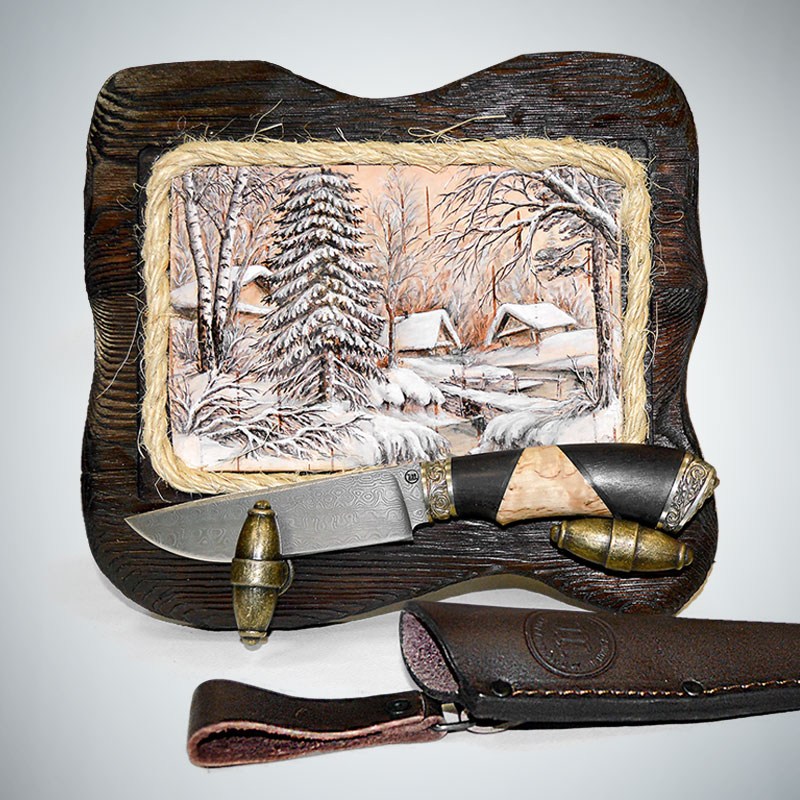 Мы соединили в наборе два популярных подарка, нож и картину, объединив охотничьей тематикой. На картине изображена мечта - тихий охотничий домик в заснеженной тайге, от которой так и веет неспешной жизнью наших предков, не обремененных современной городской суетой.