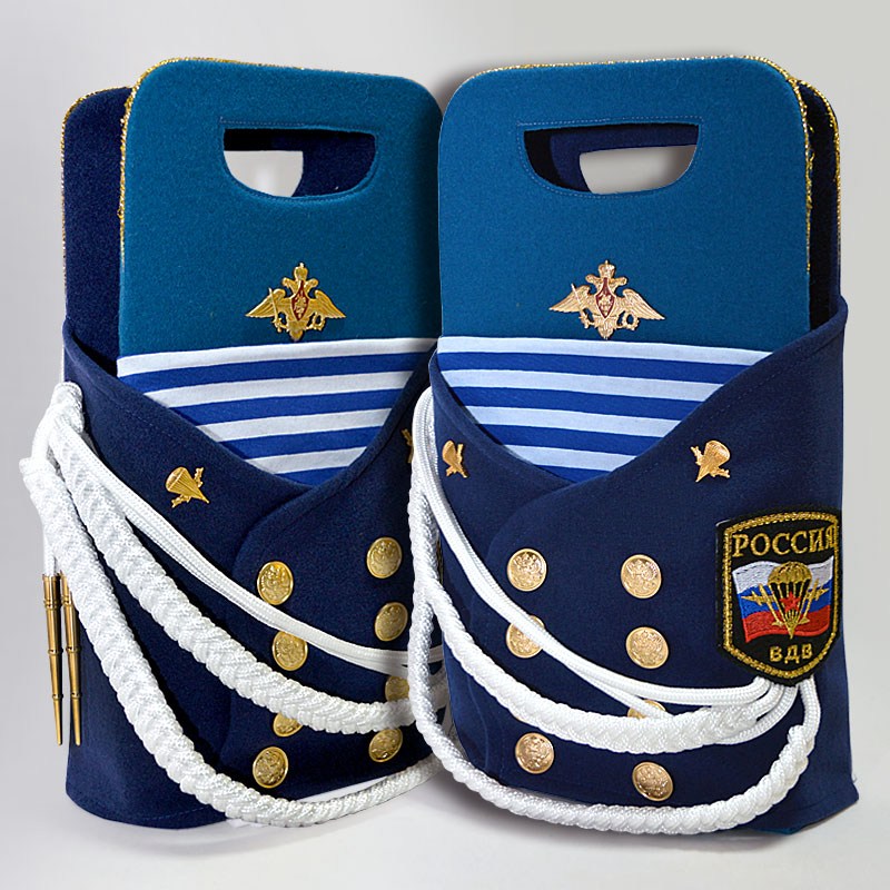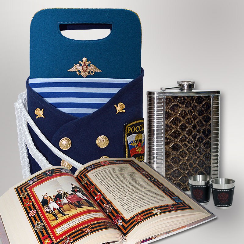 Подарочный набор "ВДВ" - это оригинальный подарок для людей, которые чтут традиции России, её победы и достижения. Внешний вид упаковки (кофр) стилизован под современную военную униформу ВДВ. Такой подход позволил придать подарку неповторимость и очень оригинальный вид. Кофр универсален, он может вмещать в себя любые подходящие по размеру подарки. Продукция уникальна, аналогов нет, это собственная разработка нашей компании. Набор включает в себя подарочный кофр из тонкого войлока, в нём подарочное издание книги "Россия. Наука побеждать" или "1812 год. Россия & Франция", стальную фляжку, две стальные стопки и тельняшку .